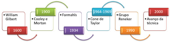 PROCESSO DE ELETROFIAÇÃO A técnica de eletrofiação de polímeros com a intenção de produzir fibras poliméricas em escala nano ou micrométrica por meio de forças eletrostáticas, atualmente é uma metodologia mundialmente reconhecida, porém passou por várias variantes históricas, conforme Figura 1, até chegar ao seu estopim de publicações.10 A primeira descrição de atração eletrostática por líquidos foi realizada em 1600 por William Gilbert. Porém, apenas em 1900 foram obtidos os primeiros dispositivos capazes de pulverizar líquidos por aplicação de carga elétrica, realização essa de Cooley e Morton. Posteriormente, em 1934 o processo foi patenteado, porém sem utilização comercial. Entre 1964 e 1969, Geoffrey Taylor estudou e publicou o modelo matemático relacionado a estabilidade eletrohidrodinâmica, processo esse que governa toda a técnica. A visibilidade acadêmica deu-se em 1990, iniciada pelo grupo de Reneker que popularizou a terminologia eletrofiação. A partir dos anos 2000, ocorreu um crescimento exponencial de publicações devido à obtenção de materiais altamente funcionais.11-13