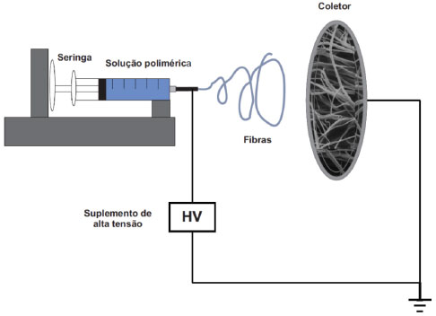![]() Figura 2. Arranjo laboratorial para sistema de eletrofiação Arranjo laboratorial para sistema de eletrofiação