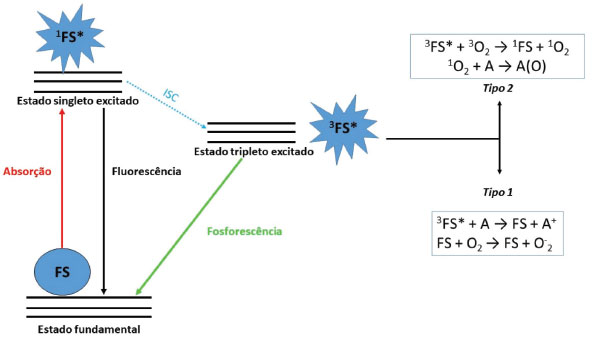 ![]() Figura 3. Diagrama de Jablonski para processos fotodinâmicos que levam a formação de espécies reativas de oxigênio. Abreviaturas: FS: fotossensbilizador no estado fundamental; 1FS*: fotossensibilizador no estado singlete excitado; 3FS*: fotossensbilizador no estado triplete; ISC: cruzamento intersistema; A: substrato orgânico