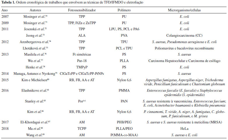 REFERÊNCIAS 1. Zhang, L.; Webster, T. J.; Nano Today 2009, 4, 66. 2. Karn, B.; Kuiken, T.; Otto, M.; Environ. Health Perspect. 2009, 117, 1813. 3. Lin, G. M.; Shang, M.; Zhang, W. G.; Adv. Mater. Res. 2014, 912-914, 305. 4. Ferreira, H. S.; Rangel, M. C.; Quim. Nova 2009, 32, 1860. 5. Peres, M. F. S.; Nigoghossian, K.; Primo, F. L.; Saska, S.; Capote, T. S. O.; Caminaga, R. M. S.; Messaddeq, Y.; Ribeiro, S. J. L.; Tedesco, A. C.; J. Braz. Chem. Soc. 2016, 27, 1949. 6. Simplicio, F. I.; Maionchi, F.; Hioka, N.; Quim. Nova 2002, 25, 801. 7. Bastos, M. M.; Boechat, N.; Gomes, A. T. P. C.; Neves, M. G. P. M. S.; Cavaleiro, J. A. S.; Rev. Virtual Quim. 2012, 4, 257. 8. Silva, E. P. O.; Mittmann, J.; Ferreira, V. T. P.; Cardoso, M. A. G.; Beltrame, M.; Lasers Med. Sci. 2014, 30, 347. 9. Nagata, J. Y.; Hioka, N.; Kimura, E.; Batistela, V. R.; Terada, R. S. S.; Graciano, A. X.; Baesso, M. L.; Hayacibara, M. F.; Photodiagn. Photodyn. Ther. 2012, 9, 122. 10. Tucker, N.; Stanger, J. J.; Staiger, M. P.; Razzaq, H.; Hofman, K.; J. Eng. Fibers Fabr. 2012, 7, 155892501200702. 11. Agarwal, S.; Greiner, A.; Wendorff, J. H.; Prog. Polym. Sci. 2013, 38, 963. 12. Braghirolli, D. I.; Steffens, D.; Pranke, P.; Drug Discovery Today 2014, 19, 743. 13. Nascimento, M. L. F.; Araujo, E. S.; Cordeiro, E. R.; de Oliveira, A. H. P.; de Oliveira, H. P.; Recent Pat. Nanotechnol. 2015, 9, 76. 14. Baptista, A. C.; Ferreira, I.; Borges, J. P.; J. Compos. Biodegrad. Polym. 2013, 1, 56. 15. Akhgari, A.; Heshmati, Z.; Garekani, H. A.; Sadeghi, F.; Sabbagh, A.; Makhmalzadeh, B. S.; Nokhodchi, A.; Colloids Surf., B 2017, 152, 29. 16. Naseri, N.; Algan, C.; Jacobs, V.; John, M.; Oksman, K.; Mathew, A. P.; Carbohydr. Polym. 2014, 109, 7. 17. Qiu, Y.; Zhu, Y.-Y.; Yan, Y.-J.; Chen, N.; Chen, Z.-L.; Blood Coagulation Fibrinolysis 2014, 25, 486. 18. Shafiee, A.; Soleimani, M.; Chamheidari, G. A.; Seyedjafari, E.; Dodel, M.; Atashi, A.; Gheisari, Y.; J. Biomed. Mater. Res., Part A 2011, 99A, 467. 19. Prabhakaran, M. P.; Venugopal, J. R.; Ramakrishna, S.; Biomaterials 2009, 30, 4996. 20. Min, B.-M.; Lee, G.; Kim, S. H.; Nam, Y. S.; Lee, T. S.; Park, W. H.; Biomaterials 2004, 25, 1289. 21. Guo, J.; Zhang, Q.; Cai, Z.; Zhao, K.; Sep. Purif. Technol. 2016, 161, 69. 22. Dharani, S.; Mulmudi, H. K.; Yantara, N.; Thu Trang, P. T.; Park, N. G.; Graetzel, M.; Mhaisalkar, S.; Mathews, N.; Boix, P. P.; Nanoscale 2014, 6, 1675. 23. Darbar, D.; Reddy, M. V.; Sundarrajan, S.; Pattabiraman, R.; Ramakrishna, S.; Chowdari, B. V. R.; Mater. Res. Bull. 2016, 73, 369. 24. Kim, D. K.; Hwang, M.; Lagerwall, J. P. F.; J. Polym. Sci., Part B: Polym. Phys. 2013, 51, 855. 25. Rosenberger, A. G.; Dragunski, D. C.; Muniz, E. C.; Módenes, A. N.; Alves, H. J.; Tarley, C. R. T.; Machado, S. A. S.; Caetano, J.; J. Mol. Liq. 2019, 112068. 26. Yang, Q.; Wang, D.; Zhang, M.; Gao, T.; Xue, H.; Wang, Z.; Xiong, Z.; J. Alloys Compd. 2016, 688, 1066. 27. Nhan, D. T.; Nhung, N. T. A.; Vien, V.; Trung, N. T.; Cuong, N. D.; Bao, N. C.; Huong, D. Q.; Hien, N. K.; Quang, D. T.; Chem. Lett. 2017, 46, 135. 28. Serbezeanu, D.; Popa, A. M.; Stelzig, T.; Sava, I.; Rossi, R. M.; Fortunato, G.; Text. Res. J. 2015, 85, 1763. 29. Costa, R. G. F.; de Oliveira, J. E.; de Paula, G. F.; Picciani, P. H. S.; de Medeiros, E. S.; Ribeiro, C.; Mattoso, L. H. C.; Polímeros 2012, 22, 178. 30. Cui, W.; Zhou, Y.; Chang, J.; Sci. Technol. Adv. Mater. 2010, 11, 014108. 31. da Silva, T. T.; Cesar, G. B.; Francisco, C. P.; Mossini, G. G.; Hoshino, L. V. C.; Sato, F.; Radovanovic, E.; Agostini, D. L. S.; Caetano, W.; Hernandes, L.; Matioli, G.; J. Appl. Polym. Sci. 2019, 48415. 32. Persano, L.; Camposeo, A.; Tekmen, C.; Pisignano, D.; Macromol. Mater. Eng. 2013, 298, 504. 33. Yarin, A. L.; Koombhongse, S.; Reneker, D. H.; J. Appl. Phys. 2001, 90, 4836. 34. Costa, R. G. F.; de Oliveira, J. E.; de Paula, G. F.; Picciani, P. H. S.; de Medeiros, E. S.; Ribeiro, C.; Mattoso, L. H. C.; Polímeros 2012, 22, 170. 35. Kriegel, C.; Arrechi, A.; Kit, K.; McClements, D. J.; Weiss, J. F.; Crit. Rev. Food Sci. Nutr. 2008, 48, 775. 36. Ramakrishna, S.; Fujihara, K.; Teo, W.-E.; Lim, T.-C.; Ma, Z.; An Introduction to Electrospinning and Nanofibers; World Scientific: Singapore, 2005. 37. Balaji, A.; Vellayappan, M. V.; John, A. A.; Subramanian, A. P.; Jaganathan, S. K.; Supriyanto, E.; Razak, S. I. A.; RSC Adv. 2015, 5, 57984. 38. Bhardwaj, N.; Kundu, S. C.; Biotechnol. Adv. 2010, 28, 325. 39. Auras, R.; Harte, B.; Selke, S.; Macromol. Biosci. 2004, 4, 835. 40. Ning, J.; Zhang, X.; Yang, H.; Xu, Z.-L.; Wei, Y.-M.; Fibers Polym. 2016, 17, 21. 41. Canbolat, M. F.; Celebioglu, A.; Uyar, T.; Colloids Surf., B 2014, 115, 15. 42. Chan, C. M.; Ko, T. M.; Hiraoka, H.; Surf. Sci. Rep. 1996, 24, 1. 43. Surucu, S.; Masur, K.; Sasmazel, H. T.; Von Woedtke, T.; Weltmann, K. D.; Appl. Surf. Sci. 2016, 385, 400. 44. Thielke, M. W.; Bruckner, E. P.; Wong, D. L.; Theato, P.; Polymer (Guildf) 2014, 55, 5596. 45. Huang, L.; Arena, J. T.; Manickam, S. S.; Jiang, X.; Willis, B. G.; McCutcheon, J. R.; J. Memb. Sci. 2014, 460, 241. 46. Gold, M. H.; Dermatol. Clin. 2007, 25, 1. 47. Ormond, A. B.; Freeman, H. S.; Materials 2013, 6, 817. 48. Allison, R. R.; Sibata, C. H.; Photodiagn. Photodyn. Ther. 2010, 7, 61. 49. Allison, R. R.; Mota, H. C.; Sibata, C. H.; Photodiagn. Photodyn. Ther. 2004, 1, 263. 50. Castano, A. P.; Demidova, T. N.; Hamblin, M. R.; Photodiagn. Photodyn. Ther. 2004, 1, 279. 51. Castano, A. P.; Demidova, T. N.; Hamblin, M. R.; Photodiagn. Photodyn. Ther. 2005, 2, 1. 52. Castano, A. P.; Demidova, T. N.; Hamblin, M. R.; Photodiagn. Photodyn. Ther. 2005, 2, 91. 53. Dai, T.; Fuchs, B. B.; Coleman, J. J.; Prates, R. A.; Astrakas, C.; St. Denis, T. G.; Ribeiro, M. S.; Mylonakis, E.; Hamblin, M. R.; Tegos, G. P.; Front. Microbiol. 2012, 3, 120. 54. Agostinis, P.; Berg, K.; Cengel, K. A.; Foster, T. H.; Girotti, A. W.; Gollnick, S. O.; Hahn, S. M.; Hamblin, M. R.; Juzeniene, A.; Kessel, D.; Korbelik, M.; Moan, J.; Mroz, P.; Nowis, 