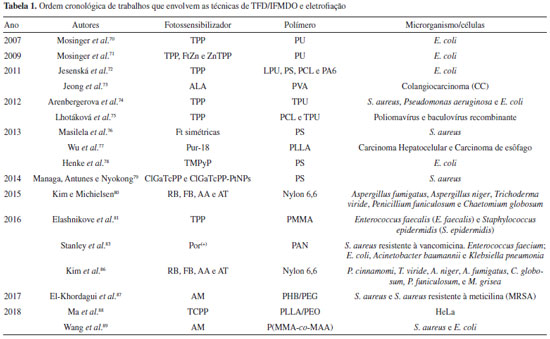 CONCLUSÃO A eletrofiação desde o seu princípio foi capaz de se moldar os vários ramos com grande facilidade e sucesso, entre os quais se destaca o trabalho conjunto com a técnica de terapia fotodinâmica. Como mostrado neste trabalho, a união das fibras eletrofiadas com fotossensibilizadores ofereceu meios inibitórios de crescimento microbiano bacteriológico, fúngico e celular (uso oncológico) com baixa dose de luz e concentração. Dentre os polímeros mais utilizados pode se destacar as formulações de poliuretana e poliestireno. Já entre os fotossensibilizadores, a TPP foi a mais estudada juntamente com as várias vertentes de ftalocianinas. Pode ser observada que a interação do FS com a matriz polimérica, bem como a disposição nas fibras, é de suma importância para obtenção de resultados satisfatórios. Ainda, o diâmetro médio é de grande relevância para difusão do oxigênio molecular e ação fotodinâmica. Em sua maioria os materiais possuem efeitos fotoativos apenas de caráter superficial, sem que ocorra a difusão do FS das fibras. Apesar dos resultados satisfatórios até o momento, apenas uma pequena gama de fotossensibilizadores e polímeros foram utilizados, assim, esta revisão sistemática permite demonstrar que uma abordagem mais profunda ainda é necessária. Espera-se, portanto, que o trabalho seja capaz de auxiliar o planejamento de futuros estudos com novos fármacos fotossensíveis, uma vez que os scaffolds são promissores e possuem grande potencial, principalmente na área de feridas de difícil cicatrização.
