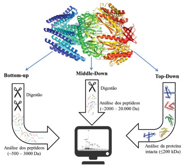 ![]() Figura 1. Abordagens proteômicas: Bottom-up, Middle-Down e Top-Down