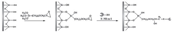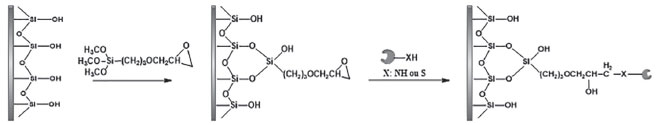 ![]() Figura 4. Reação de funcionalização do suporte com GPTMS, seguido da imobilização por ligação covalente da enzima73