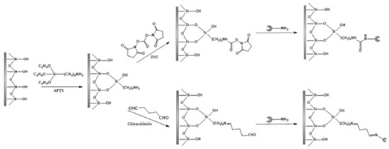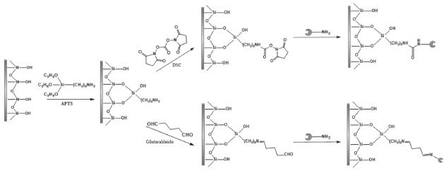 Outro exemplo de imobilização de enzimas por ligação covalente está na funcionalização do suporte com 3-aminopropiltrietoxissilano (APTS), ou outro reagente funcionalizador, seguido então da reação com carbonato de N-N'-disuccinimidila (DSC) como agente ativador ou outros grupos de cadeias carbônicas longas entre o suporte e a enzima para aumentar a hidrofobicidade do biorreator. A Figura 5 (a) exemplifica a reação de funcionalização do suporte com APTS seguido da adição de DSC e da imobilização enzimática. O grupo carboxila introduzido na superfície do suporte com a utilização do reagente DSC é altamente susceptível as reações com os grupos nucleofílicos da enzima.61,73 Outro reagente frequentemente utilizado como espaçador após a funcionalização do suporte é o glutaraldeído, o qual irá introduzir grupos carbonila ao suporte, tornando-os susceptíveis a reações com os grupos nucleofílicos da enzima, como mostra a Figura 5 (b). No caso de formação de bases de Schiff, podem-se utilizar reagentes como cianoboroidreto de sódio, tetraboroidreto de sódio e boroidreto de sódio para redução das ligações iminas formadas, indicado em casos que se trabalhe em meios ácidos.61
