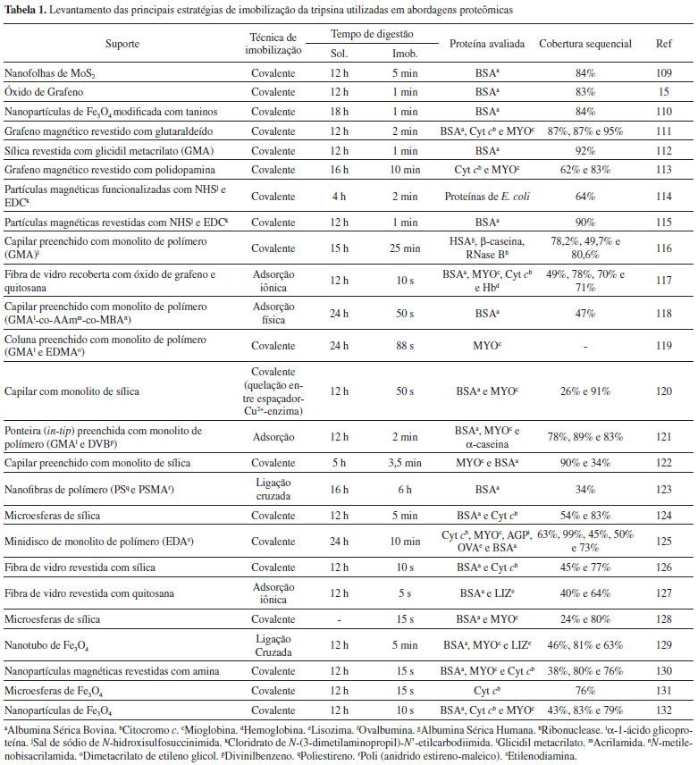 I. Departamento de Química, Universidade Federal de São Carlos, 13565-905 São Carlos - SP, Brasil Recebido em 25/11/2019 *e-mail: qcass@ufscar.br In recent years, great advances have been observed in the proteomic area regarding the different approaches adopted as top-down, middle-down and bottom-up. Regarding middle-down and bottom-up approaches, a previous step for protein digestion is necessary for further analysis of the generated peptides. Classical digestion protocols employing proteases are usually carried out in solution, which can lead to a number of disadvantages such as high digestion time, enzymatic autolysis and impossibility to reuse the enzymes. In view of these drawbacks, different approaches have been studied and applied for improving enzymatic efficiency, inhibition of autolysis, reduction of digestion time, and to minimize the number of missed cleavages. In the literature, great efforts have been made in order to achieve maximum efficiency in enzymatic digestion, with emphasis on proteases immobilization. In this review, concepts related to protein digestion, immobilization techniques, as well as the main support used for enzyme immobilization are discussed considering new tools for proteomic analysis. INTRODUÇÃO A elevada importância das proteínas nas vias metabólicas e o papel que essas desempenham nas funções fisiológicas das células, conduziu à necessidade de procedimentos analíticos específicos para a caracterização estrutural, análise funcional e conhecimento das modificações pós-traducionais das proteínas.1-3 A abordagem proteômica pode variar de estudos abrangentes, os quais auxiliam na identificação e caracterização de uma ampla variedade de proteínas presentes em amostras complexas, até as abordagens direcionadas, empregadas em estudos de proteínas específicas.1,2,4-6 A proteômica surgiu nos anos 70 com a aplicação e aperfeiçoamentos da técnica de eletroforese bidimensional em gel (2D - PAGE), a partir da qual foi possível realizar separações de proteínas de amostras complexas.7-9 No entanto, a análise detalhada com a identificação dessas proteínas só foi possível alguns anos depois com a introdução da espectrometria de massas.7,8,10,11 Durante anos a abordagem SDS-PAGE foi amplamente utilizada em proteômica, entretanto, essa técnica apresentava algumas limitações como a baixa reprodutibilidade, principalmente quando se tratava de proteínas hidrofóbicas, básicas e com massas moleculares muito elevadas ou muito pequenas. Além disso, a quantificação de proteínas era realizada por análise de "spots" proteicos (ou bandas) detectados por vários métodos de coloração (azul de Coomassie, nitrato de prata ou compostos fluorescentes), que representam as diferentes proteínas separadas (ou formas proteicas) e com diferentes intensidades de coloração de acordo com a abundância relativa. A necessidade de manipulação, com o corte das bandas do gel, também pode interferir na análise.7,9,11 Com isso, estratégias alternativas para as análises proteômicas foram desenvolvidas. Atualmente com os avanços nas técnicas de espectrometria de massas juntamente com as ferramentas de bioinformática, abordagens como top-down, middle-down e bottom-up podem ser facilmente empregadas em análises proteômicas de acordo com os objetivos do estudo (Figura 1).1,2,5,6
