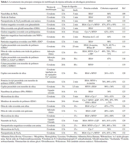 PERSPECTIVAS FUTURAS E CONCLUSÃO As diversas estratégias desenvolvidas para digestão de proteínas envolvendo tripsina imobilizada apresentam, de modo geral, menor tempo de digestão, maior número de peptídeos sendo alcançados e baixos valores de clivagens perdidas. As condições de digestão dependem não somente dos IMERs produzidos, mas também das estruturas das proteínas em digestão e, como notado por Regnier e Kim,17 a digestão de uma proteína por tripsina, em uma determinada condição, ainda não é uma ciência exata. É importante destacar que diferentes tipos de imobilização de tripsina (suporte, reação, formato, etc.) podem levar a diferentes características de digestão, com consequente impacto na identificação da relação proteína/peptídeos. No entanto, espera-se que a automação e, consequentemente, a maior reprodutibilidade dos processos de digestão realizados com IMERs de tripsina, levem a uma menor variação entre as condições de digestão proteica. Alta produtividade nos processos proteômicos tem sido observada. Devido ao elevado número de amostras, alta produtividade é desejada, especialmente em abordagens clínicas. O desenvolvimento de plataformas integradas de digestão e análise tem aumentado a capacidade de identificação de proteínas de baixa abundância em amostras de pequenos volumes. Assim, espera-se que novos suportes biocompatíveis que facilitem o manuseio e automação dos IMERs nos processos de digestão possam ser desenvolvidos e comercializados.