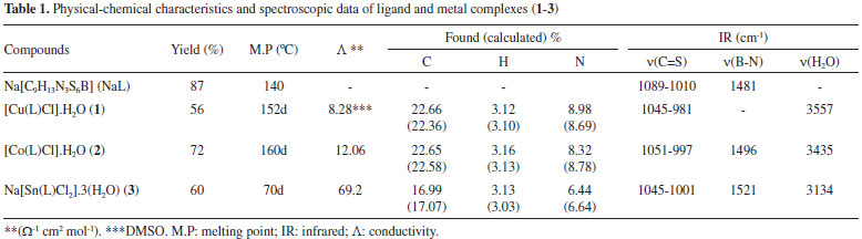 RESULTS AND DISCUSSION The Cu (II), Co (II), and Sn (II) complexes were prepared in a 1:1 molar ratio resulting in yields of 56-72% and were obtained as different colored powders (yellow, green, and yellow, respectively) that are stable in air. All the compounds and their intermediates were successfully characterized by FT-IR, UV-vis, 1H and 13C NMR. Spectral details are shown in supplementary material. The synthesis of the compounds was performed as described in the literature19 and their structures have been elicited based on characterization since X-ray crystallography was not possible due to failure of obtaining crystals for useful analysis. The results of elemental analyses (C, H, and N) are in agreement with those calculated for the suggested formula and the decomposition temperature of all metal complexes indicate the purity and the formation of a new compound.33 The 1:1 stoichiometry (L:M) is in agreement with the proposed structure through the proportion of carbon, hydrogen and nitrogen found in the complexes by the elemental analyses. The characterization data for the ligand and complexes are also summarized in Table 1. The molar conductivities of metal complexes show that compounds 1 and 2 have no electrolytic nature while compound 3, indicates that it is 1:1 electrolytes. By the infrared spectral data, the coordination was confirmed by comparing the infrared spectrum of the ligand and its derivative complexes. The ligand spectrum exhibited bands at 1481 (B-N) and 1089, 1010 (C=S).