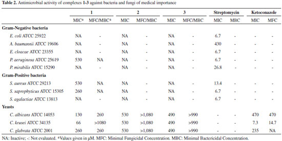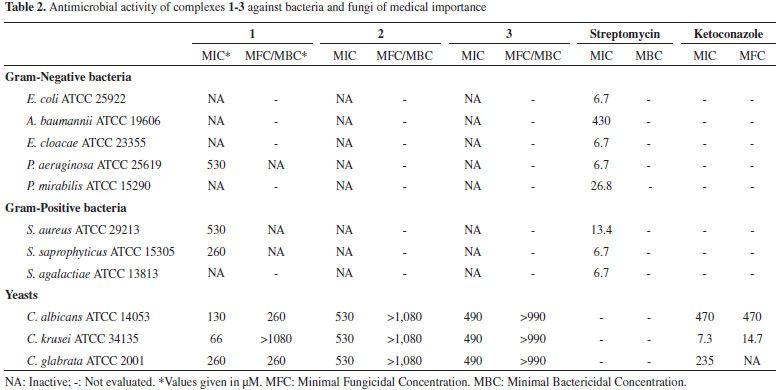 Microorganisms The microorganisms used in the study originate from the American Type Culture Collection (ATCC) and were kindly provided by the Reference Microorganisms Laboratory of the Oswaldo Cruz Foundation (FIOCRUZ), Rio de Janeiro, Brazil. Antibacterial assays were carried out using five Gram-negative (Escherichia coli ATCC 25922, Acinetobacter baumannii ATCC 19606, Enterobacter cloacae ATCC 23355, Pseudomonas aeruginosa ATCC 25619 and Proteus mirabilis ATCC 15290) and three Gram-positive (Staphylococcus aureus ATCC 29213, Staphylococcus saprophyticus ATCC 15305, Streptococcus agalactiae ATCC 13813) bacteria. In the antifungal assay, three yeasts were employed, namely Candida genus (C. albicans ATCC 14053, C. krusei ATCC 34135 and C. glabrata ATCC 2001). Antimicrobial susceptibility tests The antimicrobial activity of the ligand and the three complexes were determined using minimum inhibitory concentration (MIC) by the broth microdilution method as previously described by the Clinical and Laboratory Standard Institute (CLSI). The M27-A325 reference protocol was employed to determine antifungal activity and the M07-A926 document was followed to evaluate the antibacterial activity of the compounds, both with minor modifications.27,28 MIC assays were carried out in sterilized 96-well microtiter plates using Mueller Hinton broth (Himedia, India) and Sabouraud-dextrose broth (Himedia, India) for antibacterial and antifungal tests, respectively. The compounds were diluted in dimethyl sulfoxide 10% (DMSO; Synth, Brazil) to create stock solutions, which was serially diluted in concentrations ranging from 4 to 1,080 μmol L-1 to perform the antimicrobial tests. A volume of 100 μL containing diluted Candida and bacterial cells suspension were added to each well. Ketoconazole (Pharmanostra, Brazil) and Streptomycin (Sigma-Aldrich, Brazil) were included as a positive control in the antifungal and antibacterial assays, respectively, and DMSO was used at ≤ 2% v/v as solvent control. The plates were incubated at 35 ± 2 oC for 48 h for yeasts and 18 h for bacteria. After incubation, the MIC of each compound was defined as the lowest concentration required to inhibit visible fungal and bacterial growth. The minimal fungicidal concentration (MFC) and minimal bactericidal concentration (MBC) were determined by subculturing 0.01 mL from each well corresponding to the MIC in Sabouraud-dextrose agar (Kasvi, Germany) and Nutrient agar (Himedia, India) plates for yeast and bacteria, respectively.28 MFC and MBC were defined as the lowest concentration that prevent fungal and bacterial growth. All tests were performed in triplicate. Cytotoxicity assay Cytotoxicity of the compounds against mammalian cells was determined by the colorimetric 3-(4.5-dimethylthiazol-2-yl)-2.5-diphenyltetrazolium bromide (MTT) (Sigma-Aldrich, Brazil) assay.29 For this purpose, Vero cell line derived from the African green monkey (Cercopithecus aethiops) kidney epithelium (ATCC CCL-81; Maryland, USA) were cultured in Dulbecco's Modified Eagle medium (DMEM; Cultilab, Brazil) supplemented with 10% fetal bovine serum (Gibco, India) and 0.3% of solution content penicillin (10,000 U mL-1), streptomycin (10 mg mL-1) and amphotericin B (2 μg mL-1) (Sigma-Aldrich, Brazil). Cell cultures were maintained at 35 ± 2 ºC in a humidified atmosphere of 5% CO2 and their viability was assessed after exposure for 48 h to the compounds. The cytotoxic concentrations for 50% of the cells (CC50) in culture were calculated by linear regression analysis,27,29 and the tests were performed in three independent experiments. The relation between cytotoxicity and antimicrobial activity was determined through the selectivity index (SI).30 Selective Index values were determined by the ratio of CC50 to MIC, indicating the specificity of complexes towards pathogens and mammalian cells. Chemo-informatic analysis To calculate the physicochemical (LogP, LogS, Molecular Weight, Numbers of acceptor and donors groups of hydrogen bond), toxicological (irritative, tumorigenic and anti-reproductive effects) and pharmaceutical (Druglikeness) properties of compounds, chemo-informatics analyses were employed. The two-dimensional chemical structures of the ligand and complexes 1-3 were inserted into DataWarrior 4.2.2 software31 on a Windows platform in a Dell Vostro 2520 computer, and the parameters of interest were calculated. After, values of molecular weight, LogP, and number of donor and acceptor groups of hydrogen bonds were compared with the Lipinski's rules.32