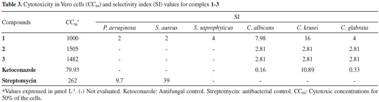 The copper complex (1) showed the best antifungal activity being four times more active than the ketoconazole against C. albicans, the most clinically relevant fungal pathogen.42 In fact, some studies have shown that copper-coordinate compounds have a higher antifungal activity than substances complexed with another transition metal such as Ni, Zn, Co or Cr.30,31,43 The antifungal effect of Cu (II) complex with porphyrin core dendrimeric ligand was two times higher compared to the Co (II) and Ni (II) complexes.44 In addition, a previous study found that the coordination of Cu (II) with amphotericin B increased its antifungal activity and reduced the toxicity of this drug against human dermal fibroblasts, indicating that the presence of this transition metal improves the therapeutic index of antifungal substances in vitro.45 Furthermore, the metal complexes with Cu (II) (compound 1) presented a low activity against bacteria, which was also evidenced by Vaidya and collaborators.46 The authors tested the antibacterial activity of some metal ion solutions (silver, copper, platinum, gold and palladium) and showed that cooper has higher MIC values against K. pneumoniae (245 μmol L-1), A. baumannii (245 μmol L-1) and E. faecium (980 μmol L-1) than all ions studied.46 The cytotoxicity assay showed that the compounds have CC50 values ranging from 1000 to 1505 μmol L-1 (Table 3) while Ketoconazole was considerably cytotoxic (CC50 of 79.93 μmol L-1) whereas streptomycin was not cytotoxic (CC50 of 262 μmol L-1). The CC50 indicated that the compounds 1-3 had low toxicity to Vero cells, which is an important predictor of safety since the majority of clinically available antimicrobials are excreted primarily via the urinary tract, where they tend to accumulate.47 In contrast to our findings, another study48 showed that copper (II) complexes with fluoroquinolonas exhibit high cytotoxicity against Vero cell (CC50 ranging from 2.19 to 2.45 μg mL-1). Such effect was attributed to the transition metal.