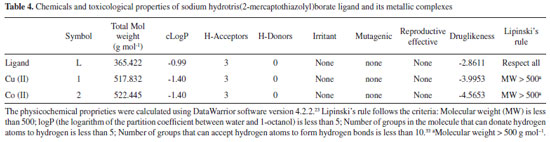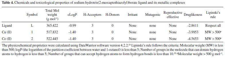 Chemo-informatic analysis showed that the number of hydrogen bond acceptor groups remained three with metal binding. The coordination compounds with Cu (II) and Co (II), as well as the ligand, suggested not to show irritant, reproductive or mutagenic effects by computational methods. In addition, we determined the compound compliance with the Lipinski's rule of five in order to predict oral absorption.32 Only the hydrotris(2-mercaptothiazolyl)borate ligand is in accordance with Lipinski's rule of five. Thus, Cu (II) and Co (II) complexes suggest a low oral bioavailability. The druglikeness of the complexes ranged from -2.86 to -4.56. This is an indicator that combines topological descriptors (such as fragments of commercialized drugs with associated druglikeness scores) and physicochemical properties (such as cLogP and molecular weights) to quantitatively determine the therapeutic potential of a molecule. Many of the clinically available drugs have a druglikeness score in the range of 0.5 to 4, while pharmacologically inert compounds generally have negative values.31 Thus, chemo-informatics analyses suggest that the metallic complexes employed in this study showed low pharmaceutical potential.