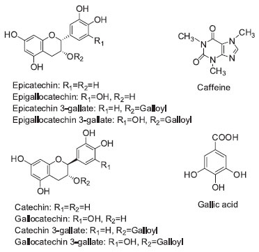 ![]() Figure 1. Structures of the major catechins, caffeine and gallic acid presents in green tea