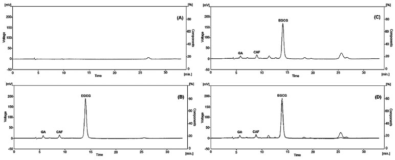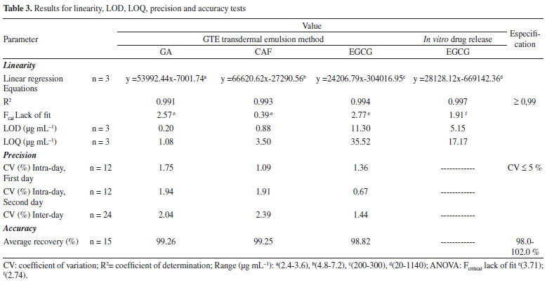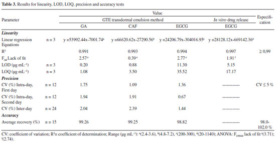 CONCLUSION The RP-HPLC method developed for the quantitative determination of GA, CAF, and EGCG in green tea transdermal emulsions meets the requirements listed in the ICH and INMETRO guidelines. The method is simple, selective, precise, and accurate. This method can be reliably used both for quality control of the green tea semisolid product and for in vitro drug release assays. In addition, the data shows that EGCG will be able to exert its biological activities systemically when used from green tea transdermal emulsion, due to its good flux rates and release percentage. Thus, this in vitro study serves as an important starting point for further in vivo studies.