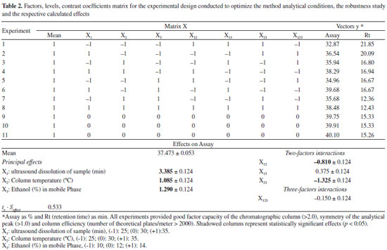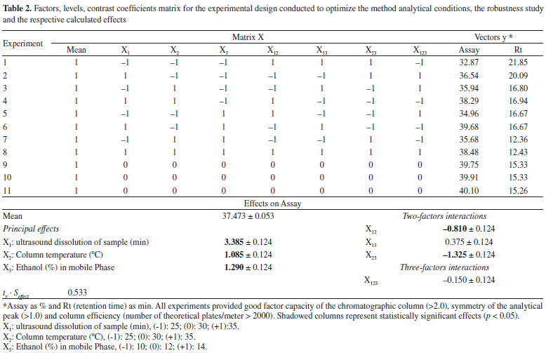 EXPERIMENTAL Reagents, reference standard, and materials Ethanol used in the preparation of the mobile phase was HPLC grade (Panreac, Spain); sodium chloride, potassium chloride, calcium chloride, magnesium sulfate, magnesium chloride, sodium sulfate, sodium bicarbonate, potassium dihydrogen phosphate, and disodium hydrogen phosphate, all were purchased from Sigma (USA). Anhydrous acetic acid and ethyl acetate (Neon, Brazil) were analytical grade. Ultrapure water, obtained from an AquaMax-Ultra 370 Series (Young Lin, Korea) (18.2 MΩ cm resistivity at 25 ºC and <10 ppb of total organic carbon), was used throughout the analysis. As working standards, CAF (Deg, Brazil), GA, and EGCG (Sigma, USA), with purities of 101.17%, 102.38% and 85.14%, respectively, previously standardized (n = 6) against the reference standards (United States Pharmacopeia (USP)) were used. GTE 95% (Pharmanostra, Brasil) was utilized as raw material. Transdermal emulsion (Phytobase®) was a kind gift from Fagron (Brazil). All the mobile phases and receptor media were filtered through a 0.45 µm filter membrane (Sartorius, Germany) and degassed by an ultrasound apparatus (Cristófoli, Brazil) for 30 min before use. All volumetric glassware used were previously calibrated. The transdermal emulsion was composed of 15% GTE (150 mg-value corrected to 157.89 mg due to extract potency), butylated hydroxytoluene (BHT) (0.5 mg) (All Chemistry, Brazil), potassium metabisulfite (1 mg) (Vetec, Brazil), and transdermal emulsion qs (up to 1000 mg). The active and antioxidant substances were accurately weighed, transferred to an agate mortar, and then geometrically homogenized with the transdermal emulsion. The product was passed through a roller mill (Fagron, USA), collected, and packed into aluminum tubes. Method development Standard and sample solutions Accurately-weighed amounts of the standards were dissolved and diluted in the different mobile phases studied to obtain working solutions with the following concentrations: GA = 3 µg mL-1, CAF = 6 µg mL-1, and EGCG = 250 µg mL-1. Amounts of transdermal emulsion containing activity equivalent to 95 mg of GTE were weighed, dissolved, and diluted in the same solvent mixture to obtain working solutions with a concentration of 475 µg mL-1. All solutions were left in heated (∼50 ºC) ultrasonic bath for 30 min and filtered through quantitative filter paper. The final solutions were filtered through a 0.45 µm filter membrane and transferred to HPLC vials. Chromatographic conditions HPLC analyses were performed in a qualified and calibrated Young Lin (Korea) chromatography system composed of: quaternary pump (YL 9110), photodiode array detector (PDA-YL 9160), automatic injector (YL 9150), column compartment (YL 9130), and software controller (Clarity). Chromatographic separation was achieved using octadecylsilane (C18) column - 250 × 4.6 mm, 5 µm particle size (Macherey-Nagel, Germany). The column was connected with a C18 pre-column, 4.0 × 3.0 mm, 5 µm (Phenomenex, USA). In order to minimize time and reagent, and optimize the factors of the chromatographic system, an experimental design approach was pursued (with focus on EGCG). The complete experimental design involved eight experiments (23) and three replicates of the central point (a total of 11 experiments in random).35 The variables considered were: ethanol content (10, 12, and 14%) in the mobile phase consisting of 1% anhydrous acetic acid solution, 3% ethyl acetate, and ultrapure water; column compartment temperature; and ultrasound time for sample dissolution. Some conditions, such as volume of injection loop (20 µL) and flow rate gradient, were kept constant. The initial flow rate of mobile phase was 0.7 mL min-1 and maintained for 12 min. Then, the flow rate was linearly increased to 1.4 mL min-1 in 5 min; this was maintained for 11 min. Subsequently, the flow rate was allowed to decrease to 0.7 mL min-1 in 5 min and then maintained at the same rate for 2 min (total run time of 35 min). Validation After the method development and optimization, validation tests were performed according to the International Conference on Harmonization (ICH)36 and the Brazilian National Institute of Metrology, Standardization, and Industrial Quality (INMETRO)37 guidelines. The following parameters were assessed: Specificity The specificity of the method was obtained through the comparison of standards, sample, and blank chromatograms. Linearity This test was conducted by plotting three standard curves, each constructed from five concentrations (corresponding to 80, 90, 100, 110, and 120% of the working solution concentrations). The data were statistically evaluated by analysis of variance (ANOVA) and subjected to the least-squares method to determine the correlation coefficient of the calibration curve. Limits of Detection and Quantification The limit of detection (LOD) and the limit of quantification (LOQ) were determined from three standard calibration curves and calculated as shown in Equation (S1) and Equation (S2)37 (Supplementary Material). Precision The test was designed to assess the degree of dispersion among a series of measurements obtained by the same analyst (intra-assay precision, repeatability), and between two analysts and two days (within-lab variations, intermediate precision), for solutions at 100% of the work-solution concentration. Repeatability was determined by consecutively analyzing six replicates of HPLC runs performed by a single analyst on a single day. The intermediate precision was also determined using six replicate HPLC runs, but performed in two days by different analysts. An injection precision of less than 5% relative standard deviation (RSD) was considered appropriate. Accuracy and recovery The determination of accuracy was performed by the method of standard additions. The 'sample only' and the 'spiked sample' with work-solution standard concentrations of 80%, 100%, and 120% (n = 3 for each concent