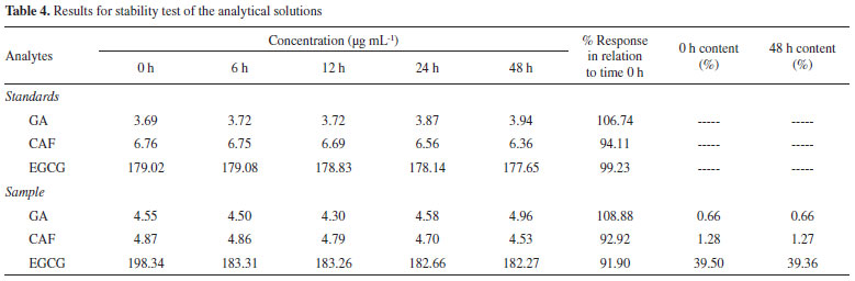 The LOD and LOQ for the samples (Table 3) were calculated from the calibration plots. These values are important within the context of diffusion experiments, as one cannot predict the drug quantities which will pass through the membrane (these have to be quantified when present in the receptor media). Fortunately, method linearity, LOD, and LOQ could be confirmed when EGCG was diluted in the receptor media (Table 3) (not in the dilutant). These results confirm that the method for transdermal emulsion can be used both for quality control of semisolid products and for in vitro drug release assays. In Table 3, the results of precision and accuracy tests are also listed. All coefficients of variation were within the recommended specification limits (<5%). The average recoveries (98%-102%) do meet the acceptance criteria.37,39 In order to evaluate the robustness of the method in the determination of the main constituent (EGCG), the complete experimental design 23 with triplicate in the central point realized was considered. The calculated values for main effects and interactions at a 95% level of confidence are shown in Table 2. The active recovery in the method was influences by all factors and their interactions. Therefore, it is important to keep the parameters strictly fixed in order to avoid changes in the results. A stability test was performed to evaluate if the analytes remained chemically unchanged in the analytical solutions. After 48 h, the concentration of all analytes remained greater than 90% of those in a freshly prepared solution (Table 4). GA showed a modest increase in its concentration over time, which coincided with the slight decrease in the concentration of EGCG. This indicated that GA was a degradation product of galloylated catechins and reinforced the importance of the regulation imposed by the USP.9 However, this difference in concentration was not significant.