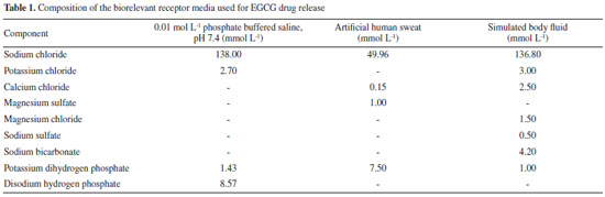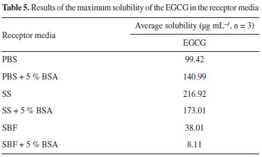 Considering the validations and taking all the data into account, it can be said that, from a practical standpoint, the method is valid for the intended goals. Receptor media for in vitro release testing The solubility of EGCG in adequate receptor media was determined (Table 5).
