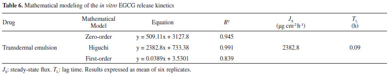 The transdermal emulsion released 8896.01 µg cm-2 of EGCG by the end of the 12 h experiment. This data was complemented with the determination of the flux (JS, µg cm-2 h-1) and lag time (LT, h) (Table 6). About 92% of EGCG in the applied dose was released to receptor medium in 12 h. The formulation showed a fast release, with a lag time of 5.4 min. This release rate is formulation-specific and can be used to monitor product quality. In vitro flux of EGCG through an artificial membrane of polysulfone (passive diffusion barrier) determined its release from an emulsion to the receiver medium. However, it is possible that the flux of EGCG is changed when it is in contact with a biological membranes, such as human skin, since resistance by stratum corneum is the major barrier to be overcome by transdermal drugs.42 Therefore, this in vitro methodology can be used a preliminary screen in the development of formulations and subsequent clinical trials. If results from in vivo testing compares well with the results of transdermal action observed in our study, the dose and the number of daily applications could be customized by the prescriber to the needs of each patient.