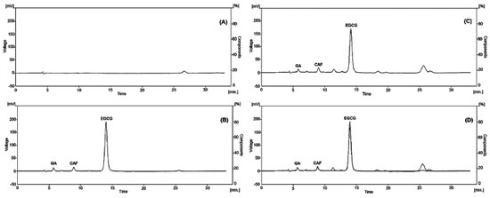 Figure 2. Chromatographic profiles obtained for the specificity test: (A), blank; (B), GA, CAF and EGCG standards; (C), sample and (D), standard and sample overlapped