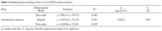 One can see that the release profile of EGCG was not linear. This indicated that its release does not follow zero-order kinetics. The data available in Table 6 confirmed that the transdermal emulsion had a R2 > 0.99 only when fitted for the pseudo-first-order model, also known as Higuchi's model. Thus, the release mechanism of these drugs is a diffusion process based on Fick's law and is dependent on the square root of time.