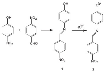 EXPERIMENTAL The melting point of 1 was recorded with an electrothermal apparatus and was not corrected. UV-Vis absorption spectra of dye solutions were obtained with a Perkin-Elmer Lambda-35 spectrophotometer. An Anton Paar Microwave 300 synthesis reactor or a commercial Groven microwave oven were used for the preparation of imine 1. 4-Aminophenol, 4-nitrobenzaldehyde, and the 1.0-M methanolic solution of tetrabutylammonium hydroxide were purchased from Sigma-Aldrich. Preparation of N-(4-hydroxyphenyl)-4-nitrobenzaldimine 1 - (a) A mixture of 4-aminophenol (0.4 g, 3.7 mmol) and 4-nitrobenzaldehyde (0.4 g; 2.7 mmol) in ethanol (50 mL) was refluxed for 90 min. The solution was cooled, and the precipitated product was filtered and dried to give 0.35 g (44% yield) of imine 1. (b) Alternatively, a mixture of 4-aminophenol (0.4 g, 3.7 mmol) and 4-nitrobenzaldehyde (0.4 g, 2.7 mmol) were thoroughly ground in a mortar and the resulting mixture was heated in a 100-mL Erlenmeyer flask in a conventional microwave oven for 3 min at high average power. The dark-red residue was triturated in ethanol and filtered to give 0.5 g of imine 1 (62% yield). (c) In addition, a mixture of 4-aminophenol (0.200 g; 1.83 mmol) and 4-nitrobenzaldehyde (0.200 g; 1.32 mmol) was heated in a microwave synthesis reactor for 1 min at 100 ºC. The dark-red residue was triturated in ethanol and filtered to give 0.17 g of imine 1 (42% yield). The imine was recrystallized in ethanol to give the pure product in the form of dark-red crystals; m.p. 172 ºC, lit.8 176 ºC. a) Solvatochromism of 2 - Solutions of 1 in ethanol, 2-propanol, and dimethylformamide were prepared at a concentration of 2.0 × 10-4 mol L-1 (ca. 1.0 mg in 20 mL). To 3 mL of each of these solutions in a test tube were added 5 µL of a 1.0 mol L-1 methanolic solution of tetrabutylammonium hydroxide (5 × 10-6 mol). The resulting colored solutions were compared, and the λmax values of the solvatochromic band of the dye were recorded. b) Preferential solvation of 2 in a binary solvent mixture - Solutions of 1 (2.0 × 10-4 mol L-1) in acetone and 2-propanol, prepared as previously described, were mixed in variable proportions to a final total volume of 3 mL. To each of these solvent mixtures was added 5 µL of a 1.0 mol L-1 methanolic solution of tetrabutylammonium hydroxide. The resulting colored solutions were compared, and the λ max values of their solvatochromic band were recorded. c) Halochromism of 2 - To a 3-mL solution of 2 in acetone, as prepared in procedure (a), was added increasing amounts of dry sodium iodide (1 mg and 8 mg). The resulting colored solutions were compared, and the λmax values of their solvatochromic band were recorded. d) Thermochromism of 2 - Two test tubes, each containing 3 mL of a solution of 2 in 2-propanol, as prepared in procedure (a), were immersed in ice water and in hot water (70-80 ºC). After 2 min, the color of the two solutions was compared and the λmax values of their solvatochromic band were recorded.