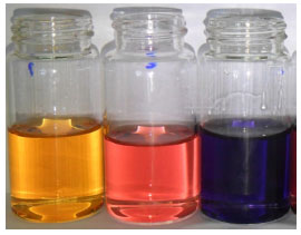 ![]() Figure 1. Color variation of solutions of 2 in solvents with decreasing polarity. From left to right: ethanol (λmax 466 nm), 2-propanol (λmax 494 nm), dimethylformamide (λmax 587 nm)