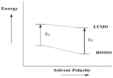 ![]() Figure 2. Schematic of the variation of the HOMO-LUMO transition energy ET of 2 in two solvents with different polarities