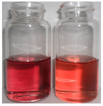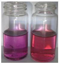 The halochromic effect is quantified by recording the spectra of these solutions. The λmax value of the halochromic band shifts bathochromically (red shift) from λmax = 537 nm in the case of 1 mg of NaI in acetone to λmax = 514 nm in the case of 8 mg of NaI. These spectral changes can be rationalized by invoking an ion-pair association between the Na+ cation and the phenolate group of the dye; this spectral shift is therefore an example of cationic halochromism. Thermochromism of 2 The variation in color of two solutions of 2 in 2-propanol at different temperatures is shown in Figure 4 as a demonstration of the thermochromism of the dye.