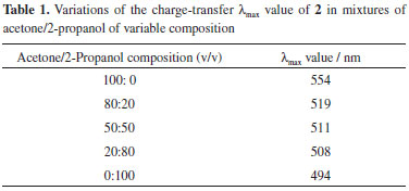 Preferential solvation of 2 in a binary solvent mixture Solutions of 2 in binary solvent mixture, such as acetone/2-propanol, exhibit different colors according to the mixture composition. The corresponding charge-transfer λmax values are listed in Table 1; these values indicate that a blue or hypsochromic shift of the band occurs as the proportion of 2-propanol is increased.