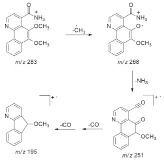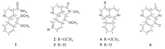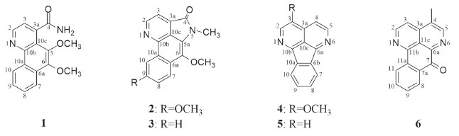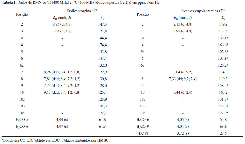 O composto 1 foi isolado como cristais amarelados. O espectro de EMAR-IES mostrou o pico do íon [M+H]+ com m/z 283,1073 (calcd. para C16H15N2O3, 283,1077), compatível com a fórmula molecular C16H15N2O3. O espectro de infravermelho mostrou absorção de duas bandas em 3306 e 3139 cm-1 de estiramento N-H2, banda de carbonila de amida em 1646 cm-1, absorções em 1618 e 1582 cm-1 de C=C de aromático, além do sinal em 1055 cm-1 de estiramento C-O. O espectro de RMN de 1H (CD3OD, 400 MHz) mostrou seis sinais de prótons aromáticos, sendo dois dupletos em δH 8,95 (d; J = 4,8 Hz) e δH 7,64 (d; J = 4,8 Hz), sugestivos para os prótons H-2 e H-3 de um anel piridínico do esqueleto azaaporfinoide,19,20 e também quatro duplos dupletos duplos compatíveis com um sistema aromático ABCD, sendo um mais desprotegido em δH 9,13 (ddd; J = 8,4; 1,2; 0,8 Hz) característico do próton H-10 desse tipo de esqueleto, um em δH 8,26 (ddd; J = 8,4; 1,2; 0,8 Hz) atribuído ao H-7 e os outros dois em δH 7,81 (ddd; J = 8,4; 7,2; 1,2 Hz) e 7,73 (ddd; J = 8,4; 7,2; 1,2 Hz) assinalados para H-8 e H-9, respectivamente. Além desses sinais, foram ainda observados dois simpletos, ambos integrando para três prótons, em δH 4,07 (s) e δH 4,04 (s), correspondentes a duas metoxilas. No espectro de 13C (CD3OD, 100 MHz) foram observados dezesseis sinais. Desses, seis denotam ser de carbonos metínicos aromáticos e dois de grupos metoxila, confirmando dessa forma os dados observados no espectro de RMN de 1H. Observou-se também um sinal característico de um grupo carbonila e mais sete sinais indicativos de carbonos aromáticos não hidrogenados. A análise desses dados e do espectro de correlações HSQC permitiram atribuir os sinais dos carbonos metínicos em δC 147,3 e 121,8 aos carbonos C-2 e C-3, o primeiro mais desprotegido por estar ligado a um heteroátomo, e em δC 122,9, 130,8, 128,0 e 125,4 aos carbonos C-7, C-8, C-9 e C-10, respectivamente. Os demais carbonos foram definidos com auxílio das correlações a longa distância (2J e 3J) observadas no experimento HMBC (Figura 2), que permitiu também confirmar as demais atribuições já sugeridas. A correlação dos sinais em δH 8,95 (H-2) com δC 121,8 (C-3), 144,4 (C-3a), 144,3 (C-10b) e em δH 7,64 (H-3) com δC 147,3 (C-2), 174,4 (C-4), 122,1 (C-10c) estabeleceu os valores dos carbonos C-3a, C-10b e C-10c, bem como ratificou a posição da carbonila em C-4. A correlação dos sinais em δH 7,81 (H-8) e δH 9,13 (H-10) com δC 132,0 (C-6a) e em δH 8,26 (H-7) e δH 7,73 (H-9) com δC 128,9 (C-10a) determinou o deslocamento dos carbonos C-6a e C-10a. Além dessa correlação, o sinal em δH 8,26 (H-7), assim como o δH 4,07 (H3CO-6), correlacionaram-se com δC 147,4 (C-6), permitindo dessa forma atribuir o deslocamento de C-6, substituído, portanto, por um grupo metoxila. A localização da segunda metoxila foi definida por meio da correlação do sinal em δH 4,04 (H3CO-5) com o sinal em δC 143,8 (C-5). Para confirmar o grupo NH2 na estrutura química, a amostra foi submetida a análise de RMN de 1H em CDCl3, na qual pôde-se observar dois sinais largos em δH 5,74 e 5,87 que desapareceram ao adicionar-se D2O (Figuras 9S e 10S). Assim, com base nesses dados, foi possível propor para 1 a estrutura mostrada na Figura 1, um novo alcaloide azafenantreno denominado dolichocarpina. Sua análise por EMn apresentou os íons indicados na Figura 2S e a proposta de fragmentação desses íons pode ser observada na Figura 3.21,22