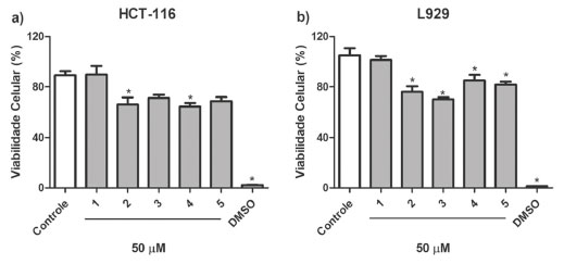![]() Figura 4. Citotoxicidade dos compostos 1 - 5 em linhagens de células HCT-116 e L929, após 72 h de tratamento. Os valores representam a média ± erro padrão de quatro replicatas na concentração de 50 μmol L-1 (*p < 0,05 comparado ao grupo controle)