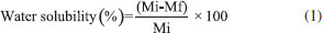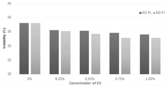 ![]() Figure 3. Solubility (%) of films made from arrowroot starch enriched with EOs from P. aduncum leaves (EO PL) and inflorescences (EO PI)