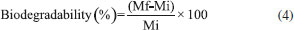 MATERIAL AND METHODS Plant material and extraction of EOs Procedures used for acquiring the plant material and extracting EOs from P. aduncum leaves and inflorescences are the ones that have previously been described by our research group.15 In this case, EOs were refrigerated at 4 ± 2 °C and stored up to the moment in which they were incorporated into the filmogenic solutions. Development of biodegradable films Biodegradable films were obtained by the casting method, in agreement with the methodology proposed by Issa and his collaborators,17 with some modifications. In order to obtain films, 5 g commercial arrowroot starch was dissolved in 100 mL distilled water; the mixture was moderately agitated at room temperature (25 °C). Afterwards, this solution was heated at 80 °C under constant agitation for 30 minutes. After starch gelatinization, glycerol was added as a plasticizer (30% w/w); this dispersion was then agitated for 5 minutes. When the filmogenic solution reached 40 °C, a previously prepared suspension of EOs from Piper aduncum in Tween 80 (SigmaAldrich®) (0.25 g/g EOs) was incorporated into it under constant agitation for 15 minutes. Filmogenic solutions made from arrowroot starch - into which EOs from P. aduncum leaves and inflorescences were incorporated - were poured on polyethylene trays and dried in an oven with air circulation at 35 °C for about 48 hours, up to the point in which films detached from the trays. Final concentrations of EOs from P. aduncum leaves and inflorescences were 0.25%, 0.50%, 0.75% and 1% (v/v), besides a control treatment (with no EOs). Thickness and moisture Film thickness was measured by a digital micrometer, with 0.01 mm accuracy. Ten spots were measured on every film and thickness mean was calculated. Humidity content was determined by loss of film mass after films had been dried in an oven at 110 °C, up to the moment they reached constant weight. Three replicates were carried out in every treatment.18 Measurement of water solubility In order to determine water solubility of resulting active films, samples that measured about 2 cm2 were dried in an oven at 105 °C for 3 hours and then weighed so that initial mass (Mi) could be determined. Afterwards, they were immersed in 50 mL distilled water and kept under constant agitation at 25 °C for 24 hours. Then, samples were filtered through Whatman filter paper Grade 1. In the literature,10 films were dried at 105 °C for 24 hours and weighed (Mf). Every treatment was analyzed in triplicate. Film solubility (%) was calculated by the following equation (1): ![]() Water vapor permeability Water vapor transmission rate (WVTR) and water vapor permeability (WVP) were evaluated in agreement with Salas-Valero et al. by the water method.19 In order to carry it out, 10 mL-Becker flasks were filled with 5.0 g deionized water, sealed with the films and then placed in a desiccator which held a saturated solution of potassium nitrate (KNO3 - Sigma-Aldrich®). Masses in the Becker flasks were measured every hour for 8 hours and then again at the 24th hour.20 The experiment was performed in triplicate. Both WVTR and WVP were calculated by the following equations (2 and 3): ![]() where m is mass loss, t is time and A is film area. WVP was calculated by multiplying WVTR by film thickness (E) and dividing it by the pressure difference (ΔP): ![]() Biodegradability Biodegradability was analyzed by the methodology proposed by Martucci and Ruseckaite,21 with some modifications. Film samples (2 x 3 cm) were dried up to constant weight so that initial mass (Mi) could be found. Samples were placed in microperforated polyethylene bags, enabling microorganisms and humidity to access them. However, packaging was conducted so that samples could be recovered later. Samples were then buried in previously prepared organic soil in a plastic box at relative humidity around 40% and at room temperature (25 °C). Fifteen days after the experiment outline, bags with biodegraded samples were removed from the soil, washed with distilled water and dried up to constant weight (Mf). Biodegradability (%) was calculated by the following equation (4): ![]() Color analysis The analysis of film color was carried out by a colorimeter (HunterLab, Color Quest II, Reston, USA). Parameters under evaluation were L* (luminosity) and chromaticity (a* and b*). Measurements were conducted by placing the white pattern on the film sample (L* = 99.94, a* = -0.52 and b* = 1.43). ΔE was related by the mean of five measurements per film.12 Difference in color (ΔE) was calculated by the following equation (5): ![]() Analysis of the UV-vis light transmission rate Ultraviolet-visible light transmission of films was carried out by a UV-vis spectrophotometer (LAMBDA 750, PerkinElmer). Film samples were placed on a film holder and transmittance was measured at wavelengths that ranged from 250 to 850 nm, in agreement with the methodology employed by Hosseini et al.22 Scanning electron microscopy (SEM) The analysis of film microstructure was carried out by a scanning electron microscope (JSM - IT300, Jeol) in the Microscopy Laboratory at the Centro Regional para o Desenvolvimento Tecnológico e Inovação de Goiás (CRTI - GO). Images were magnified 1000x. Antifungal activity Antifungal activity of films was analyzed against phytopathogenic fungi Colletotrichum gloeosporioides (CCT 5177) and Rhizopus microsporus var. oligosporus (IOC 3801) by a disk diffusion test.20 Petri dishes, half full with PDA, were inoculated with 100 µL suspension with 105 CFU mL-1. Then, three samples of films which had been cut in circles with about 5 mm in diameter were placed on every dish. Dishes were incubated at 25 ± 2 °C for 5 days. Finally, diameters of the zone of inhibition were measured. Statistical analysis Experiments had a completely randomized design (CRD), data were submitted to the analysis of variance (ANOVA) and means of replicates were analyzed by the Tukey's te