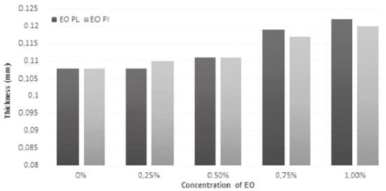 ![]() Figure 1. Thickness (mm) of films made from arrowroot starch enriched with EOs from P. aduncum leaves (EO PL) and inflorescences (EO PI)