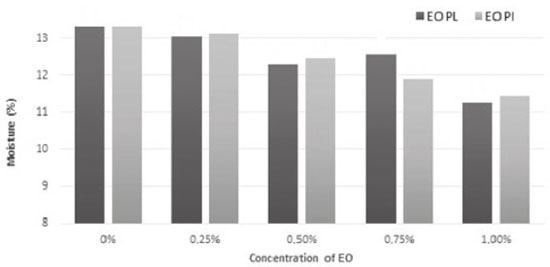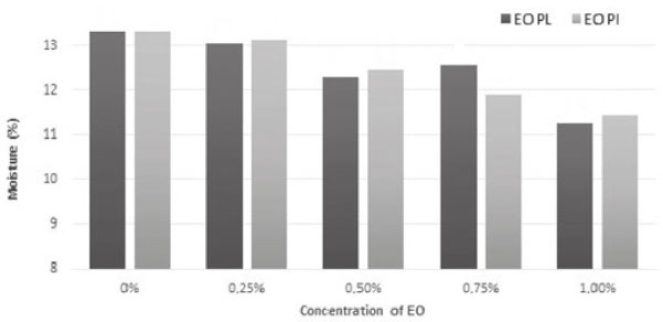 ![]() Figure 2. Moisture (%) of films made from arrowroot starch enriched with EOs from P. aduncum leaves (EO PL) and inflorescences (EO PI)
