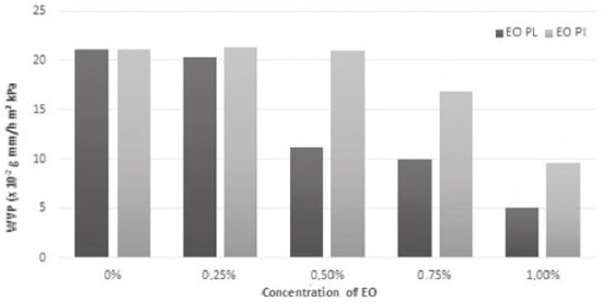 ![]() Figure 4. Water vapor permeability (WVP) (x10-2 g mm/h m2 kPa) of films made from arrowroot starch enriched with EOs from P. aduncum leaves (EO PL) and inflorescences (EO PI)