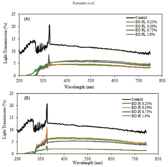 Concerning parameters of color, Hafsa et al.33 observed that they were directly affected in chitosan films after EOs from Eucalyptus globulus were incorporated into them. These authors used concentrations of 0, 1, 2, 3 and 4%; increase in concentrations led to decrease in film luminosity and changes in color towards red (a*) and yellow (b*). Figure 5 shows light transmission rates (%) of arrowroot films into which EOs from P. aduncum leaves and inflorescences were incorporated, in the range from 250 to 850 nm. Results found in the UV region (from 250 to 370 nm) showed that the control films made from arrowroot starch (with no EOs) exhibited good barrier property against UV light, since it decreased up to 85% of UV transmission in this range. Adding EOs from P. aduncum leaves and inflorescences to films decreased light transmission in the UV range up to 100% at all concentrations under analysis. Guerrero et al.34 evaluated light transmission of films made from soybean protein into which epoxidized soybean oil, olive oil and lactic acid were incorporated, by comparison with some common plastic films (oriented polypropylene and low-density polyethylene). Light transmission rates of both oriented polypropylene and low-density polyethylene films were 71.78940% and 27.64510%, respectively, at 280 nm. Films made from soybean protein and films into which oils and lactic acid were incorporated had their light transmission rates significantly decreased (0.00871% in the case of films made only from soybean protein at 280 nm). Light transmission rate of arrowroot films enriched with EOs from P. aduncum was as low as the one of films produced by Guerrero et al.34 It shows the potential of films made from biopolymeric material, such as starch and soybean protein, as barriers against lipid oxidation in food caused by exposure to UV light.