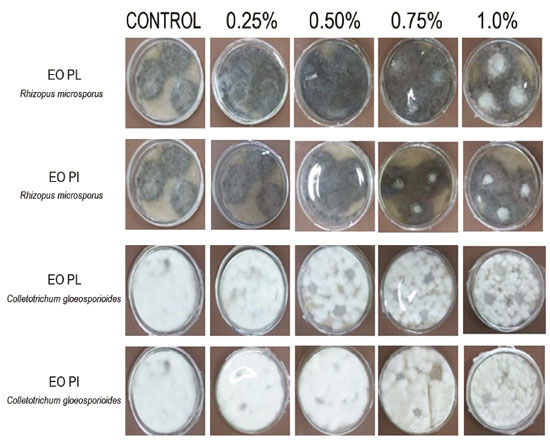 ![]() Figure 6. Antifungal activity of films made from arrowroot starch enriched with EOs from P. aduncum leaves (EO PL) and inflorescences (EO PI) against both fungi Rhizopus microsporus and Colletotrichum gloeosporioides