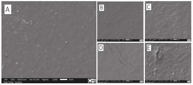 ![]() Figure 8. SEM images (magnified 1000x) of films made from arrowroot starch: control (A) and enriched with EO PI at 0.25% (B), 0.50% (C), 0.75% (D) and 1.0% (E)