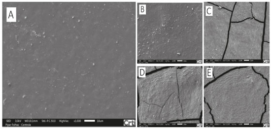 ![]() Figure 7. SEM images (magnified 1000x) of films made from arrowroot starch: control (A) and enriched with EO PL at 0.25% (B), 0.50% (C), 0.75% (D) and 1.0% (E)