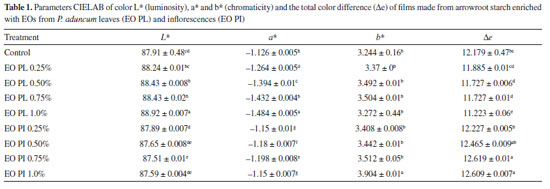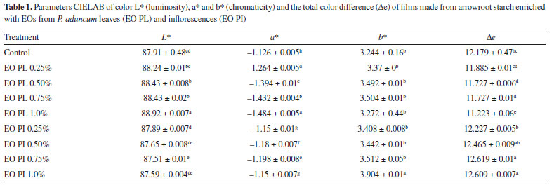 Biodegradability The analysis of biodegradation of arrowroot films with EOs from P. aduncum leaves and inflorescences was carried out in the soil; its relative humidity was kept at 40% so that films could be submitted to conditions found in the natural environment. The mixed microflora found in organic soil (bacteria, actinobacteria, fungi and protozoa) may act during film degradation.21 Fifteen days after the implementation of the experiment, total degradation of arrowroot films (100%) was observed when samples of organic soil were collected. Stoll et al.31 reported 96.27% of degradation of films made from manioc starch into which anthocyanins had been incorporated; since it took place just 10 days after the beginning of the experiment, it showed the relevant degradation capacity of films made from starch. Optical properties It is important to evaluate the color of biopolymeric films for food packaging since it may influence consumers' acceptance.24 Incorporation of EOs from P. aduncum leaves into arrowroot films led to a little increase in L* values, by comparison with the control. This increase was significant when EO PL concentration reached 0.50%, thus showing that films became clearer. When EO PI was incorporated into films, there was little decrease in L* values; it was only significant when EO PI concentration was 0.75%. L* values of all films got close to 100 (white), a fact that showed that arrowroot films enriched with EOs from P. aduncum are glossy.32 Besides, incorporation of EOs increased negative a* values significantly. Negative a* values of chromatic coordinates show that films tended to "greener" hues, mainly after having incorporated EO PL. The highest a* values were found in the films enriched with EO PL at 1.0% (-1.48). Regarding b* values, no films, except the one enriched with EO PI (1.0%), exhibited significant differences (p < 0.05), by comparison with the ones of the control. Chromatic coordinates b* with positive values show that films exhibited yellow hues in this parameter. Even though ΔE values varied considerably after EO PL was incorporated into the films, the ones into which EO PI was incorporated exhibited values that were closer to the ones of the control (Table 1).