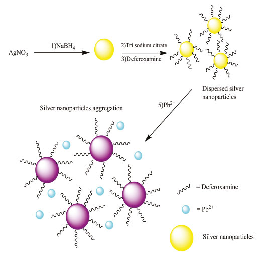 RESULTS AND DISCUSSION Mechanism of assay Preliminary experiments with silver nanoparticles were performed to reach the optimal conditions and improving sensitivity of the assay for Pb2+ determination in environmental water samples. The effect of silver nanoparticles, deferoxamine, trisodium citrate and sodium chloride concentrations, pH and reaction time were studied. The basis of Pb2+ determination is illustrated in the Scheme 1. This drug used to treatment of patients that suffering β-thalassemia for ability of this drug to create strong complexes with heavy metals. When deferoxamine was added to the solution contains citrate capped nanoparticles, silver nanoparticles were dispersed and aggregation of silver nanoparticles did not happen but when Pb2+ was added to the solution, due to chelation of Pb2+ with deferoxamine, aggregation of silver nanoparticles happened.
