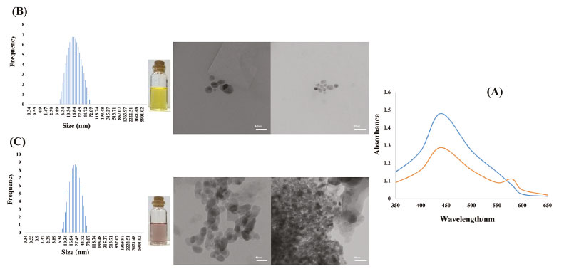 Figure 1 shows absorption spectra of silver nanoparticles demonstrating that silver nanoparticles have a peak around 440 nm (blue). This Figure also shows when aggregation of silver nanoparticles with adding Pb2+ occurs, characteristic absorbance decreases, and a new broad absorption band appears in around 580 nm (red). Color of silver nanoparticles changes from light yellow to light violet or violet that depends on Pb2+ concentration. Aggregation of silver nanoparticles with adding Pb2+ and deferoxamine is supported with DLS and TEM images (Figure 1).