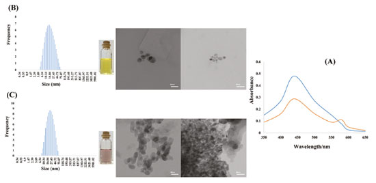 ![]() Figure 1. Absorption spectra in absence (blue) and in the presence (red) of 0.55 µmol L-1 Pb2+ (a). TEM images and color of silver nanoparticles and DLS analysis of silver nanoparticles (b) in absence and (c) in the presence of 0.92 µmol L-1 Pb2+