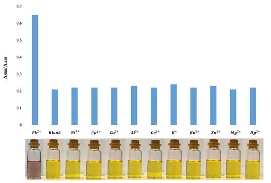 ![]() Figure 2. The absorption ratio value (A580/A440) and images of silver nanoparticles in the presence of interferences including metal ions (Ni2+, Cu2+, Ca2+, Al3+, Co2+, K+, Ba2+, Zn2+, Mg2+, Hg2+). Concentration of Pb2+ is 1.29 µmol L-1 and concentration of all metal ions considered 50 times higher than Pb2+