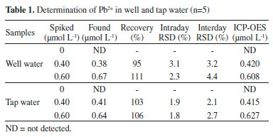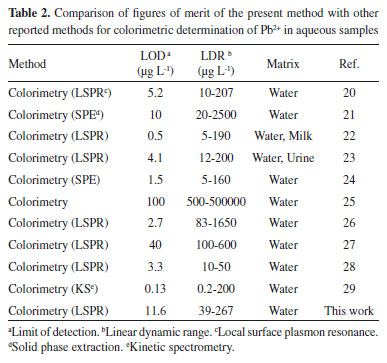 CONCLUSION In this assay silver nanoparticles capped with citrate are used for determination of Pb2+ based on silver nanoparticles aggregation. We observed high sensitivity and good linear calibration curve. Under optimized conditions, DLR was from 0.19 to 1.29 µmol L-1 and limit of detection was 0.056 µmol L-1. The figures of merit obtained are in good agreement with reported colorimetric researches.20-29 The main advantages of the proposed method are simplicity, sensitivity, low cost, and ease of operation.
