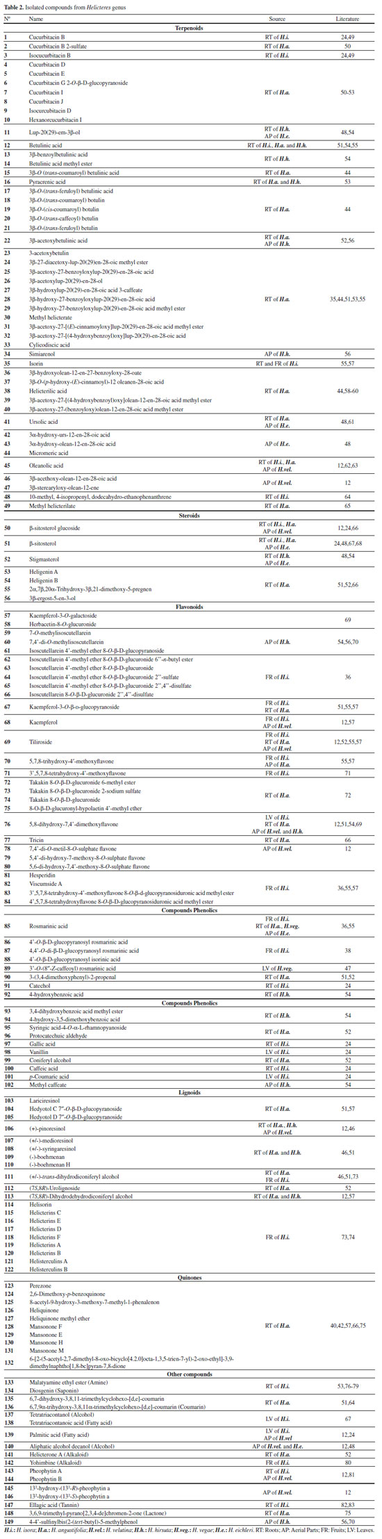 The juice of H. isora root is used in Tradicional Chinese Medicine for diabetes treatment, while fruit extract is used in various intestinal disorders to relieve colic and as an anthelmintic medicine against tapeworm.22-24 The root tea of H. angustifolia is used to treat influenza symptoms and to inhibit tumor growth.25 H. sacarolha preparations with roots and leaves, in form of decoction, infusion or maceration, are used for liver complications, ovarian inflammation, amenorrhea and blood purification,8 while the aerial parts of H. velutina are used by indigenous tribe Pankarare/Brazil as insect repellent.26 Ethnopharmacological research with species of this genus acts as a subsidy to the pharmaceutical interest and registration of the empirical uses of medicinal plants in traditional communities associated with chemical-pharmacological tests generates useful knowledges to lead to the development of new drugs. Phytochemistry profile In literature, 46 references on the phytochemistry field with species of Helicteres genus were found, 39 of which referring to the studies with H. isora and H. angustifolia. Furthemore, papers reporting research in this area with the species H. hirsute,38,46 H. vegae,47 H. velutina12 and H. eichleri48 were found, 149 compounds were isolated and identified from Helicteres (Table 2) among the most reported classes. All substances are compiled in the Table 2 (compounds) and Figure 2 (structures).