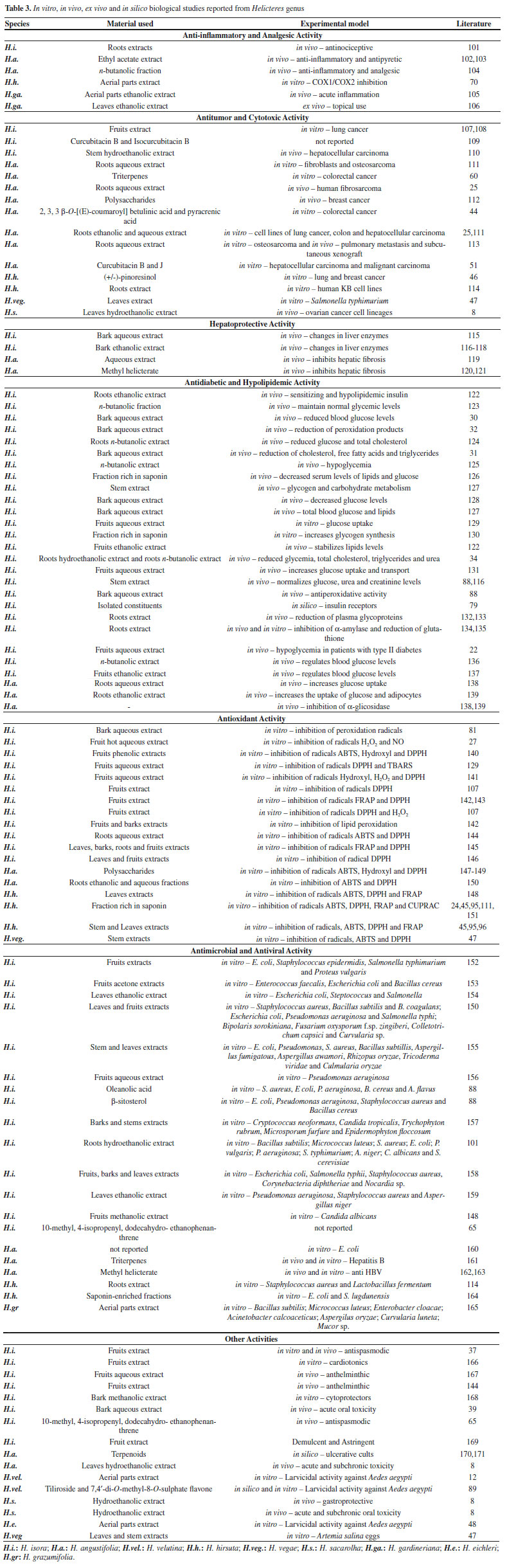 CONCLUSIONS Helicteres L. is one of the genera belonging to Sterculiaceae clade in Malvaceae family with several notable activities. Previous studies have revealed that terpenoids, flavonoids and lignoids are the dominant constituents of Helicteres species. However, information about this genus is scarce and not systematic. The in vitro and in vivo studies carried out to date prove traditional medicine reports regarding the activities of those species. However, pharmacological tests with isolated substances are still rare from this genus and its compounds, especially those unpublished in the literature, resulting in unexplored potentials. Given the presented data, it is extremely important to continue exploring the chemical and biological potentials of these and other species present in the American and Asian flora, considering the need to find substances with biological activities that may be used for mankind benefit.
