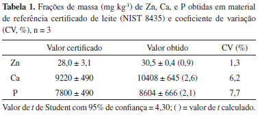 RESULTADOS E DISCUSSÃO Determinação dos teores totais A composição química e a determinação dos teores de minerais no leite são importantes para o entendimento da influência fisiológica na nutrição humana e animal e a toxicidade dos elementos traço.14 Os resultados obtidos para o material de referência certificado e para as amostras estudadas estão apresentados respectivamente nas Tabelas 1 e 2.