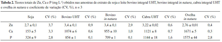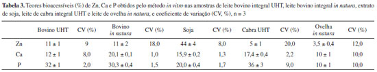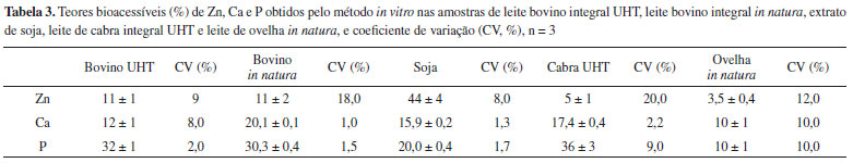 | Bioacessibilidade de zinco, cálcio e fósforo em extrato de soja e amostras de leite bovino, caprino e ovino Bioacessibility of zinc, calcium and phosphorus in soybean extract and cow, goat, sheep milk samples |