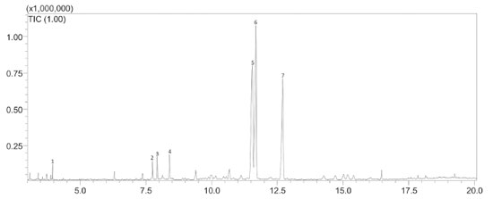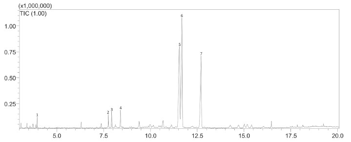 Seven compounds were identified in the essential oil by comparing the RI (literature and RI taken from NIST 2008 library) and mass spectra of each peak with the NIST and 1.3 FFNSC libraries (similarity >90%). The major compounds identified were ar‑turmerone (5), turmerone (α-turmerone) (6) and curlone (β-turmerone) (7). Some minor components were also identified, including α-phellandrene (1), α-curcumene (ar-curcumene, curcumene) (2), β-bisabolene and (3) β-sesquiphellandrene (4) (Table 2).