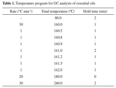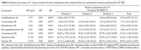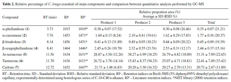 EXPERIMENTAL Plant material About one kilo of each sample of turmeric rhizomes was collected in February 2011 from three commercial producers (Producer 1 São Manoel Farm, producer 2 Manchão Branco Farm, and producer 3 Raimundo Farm) in Jaborandi City (13º37"10'S, 44º25"58'W) located in the Brazilian savanna (Cerrado) biome. Twelve samples were collected in the late afternoon in a period of occasional rainfall. Rhizomes were sliced, dried at 40 ºC for 10 h and stored in paper bags. All plant materials were identified by Prof. Patrícia Baier Krepsky (Multidisciplinary Institute in Health, Federal University of Bahia, Brazil) based on the macroscopic and microscopic description presented in the Brazilian Pharmacopoeia.38 Samples have been deposited at the vegetable drug collection of the Federal University of Paraná with the numbers 122A10, 122A11, 122A12 and 122A13 (producer 1); 122A14, 122A15, 122A16 and 12A17 (producer 3) and 22A18, 122A19, 122A20 and 122A21 (producer 2). For this study, the authors obtained authorisation of access to the Brazilian System for the Management of Genetic Heritage and Associated Traditional Knowledge-SISGEN (# AB58325). Variability in the essential oil yield To determine the essential oil yield, five grams of each sample with about 100 mL of water was subjected to the hydro-distillation method for 4 h, using a Clevenger-type apparatus with 0.5 mL of xylene to solve the essential oil extracted, according to the Brazilian Pharmacopoeia procedure.39 After extraction, the essentials oils were measured directly in the extraction apparatus, and the content (%) was calculated as volume (mL) of essential oil per 100 g of dry plant material. These extractions were done in triplicate for each sample 1 month after the collection. All samples were triturated for no more than 1 day before analysis because of the sensitivity of the turmeric components. Average, standard deviation and relative standard deviation were calculated for the group of samples obtained from each producer as well as for the total number of collected samples. Comparisons between results obtained for each producer's samples were performed by the analysis of variance (ANOVA), applying Tukey's test to compare mean values, using the GraphPad Prism software, version 5. These results were compared with the essential oil yield recommended by the Brazilian Pharmacopoeia.38 Essential oils were stored in the freezer before conducting further chromatographic analysis. Analysis of the chemical profile of essential oil and curcumin by thin-layer chromatography Thin-layer chromatography (TLC) was used to verify the essential oil profile using silica gel GF254 of approximately 250-mm thickness.39 The mobile phase was optimised previously to hexane/ethyl acetate (9:1), and the essential oils obtained from all the 12 samples were diluted in xylene (1:1) before spotting onto the TLC plates. The plates were visualised by spraying anisaldehyde solution. (366 nm).38 Qualitative and quantitative analysis by gas chromatography coupled to a mass spectrometer The essential oils were analysed using a Shimadzu® QP2010 gas chromatography apparatus directly interfacing with mass (MS), equipped with a 5% diphenyl 95% dimethyl polysiloxane capillary column (30 m × 0.25 mm, 0.25 µm of film thickness). Helium was used as the carrier gas. The mass detector of the GC-MS equipment was operated in an electron-impact mode, with a scan range of 45-500 amu, an ionisation energy of 70 eV and a scan rate of 0.30 s per scan. The temperatures of the ionisation source and the injector were maintained at 200 ºC and 240 ºC, respectively. Other GC conditions such as the flow rate, the concentration of the sample and the separation temperature programme were optimised to provide a better separation of components in a shorter run time. Chemical constituents were identified by referring to compounds reported in the literature and by comparing their mass spectra with those of known compounds available in the database of NIST 2008 (National Institute Standard and Technology) and Flavour and Fragrances of Natural and Synthetic Compounds (FFNSC) 1.3 libraries. The identification was further supported by the calculation of their retention indices under identical experimental conditions using n-alkanes (C10-C40) series (Sigma Aldrich, USA). Retention Index (RI) was calculated for each main compound and compared to those reported in the literature data. The relative percentage of each compound present in rhizome oil was calculated using the corresponding peak area integration, performed automatically using their own software (GCMSsolution®). A cheque of the integration of each peak was conducted and corrected manually if necessary. The composition was reported as a relative percentage of the total peak area. Average, standard deviation and relative standard deviation (%) of the relative proportion areas (%) were calculated for each major peak identified and their respective retention times. Plant drug stability Analyses were repeated for five samples 6 months later to verify the chemical stability. A paired Student's t-test was used to assess whether the samples had stability in terms of the essential oil yield and the relative area of the major oil components by gas chromatography. Besides, the effect of the Clevenger extraction on the volatile compounds were evaluated analysing the composition of these volatiles after extraction of 1 g of three samples with 20 mL hexane. The extract was injected in the GC‑MS employing the same conditions.